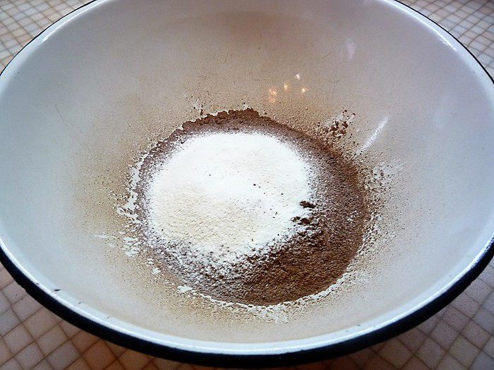 Готовим крем. В кастрюлю просеиваем какао-порошок и муку.
