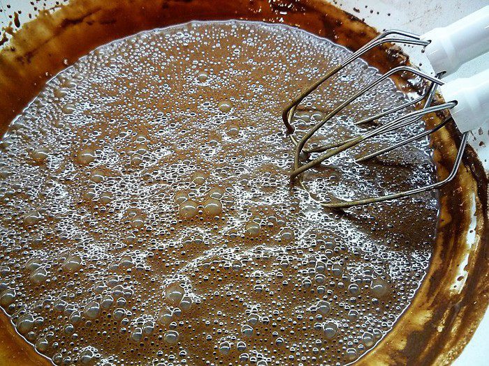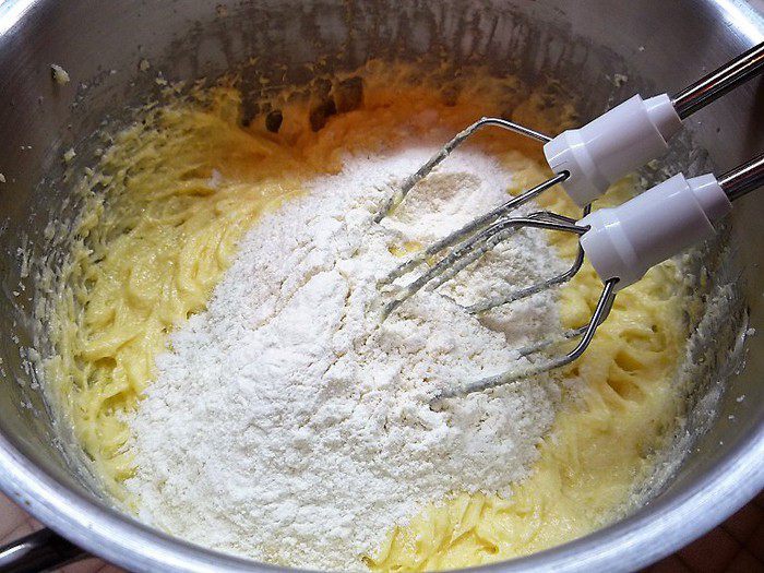 Добавляем воду и взбиваем миксером до однородной массы. Добавляем сгущенное молоко и взбитые желтки. Еще раз хорошо взбиваем.