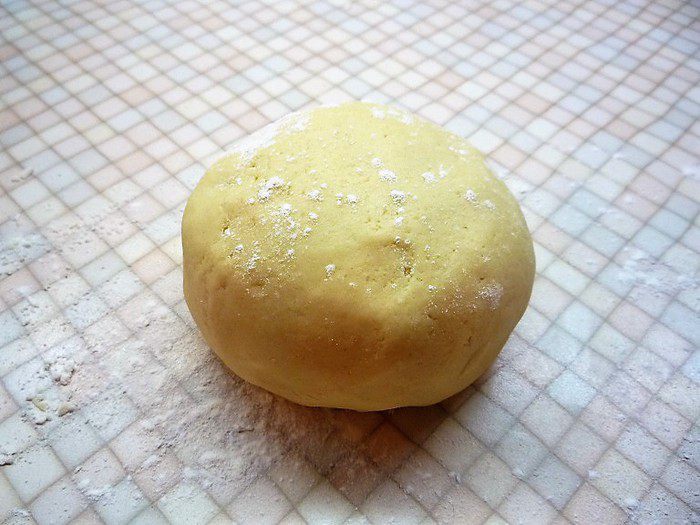 Скатываем тесто в шар, заворачиваем в пищевую пленку и убираем на 20 — 30 минут в холодильник.
