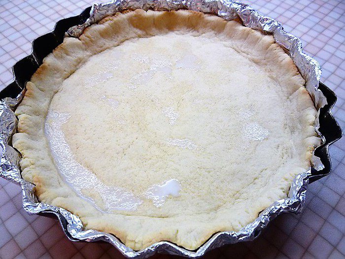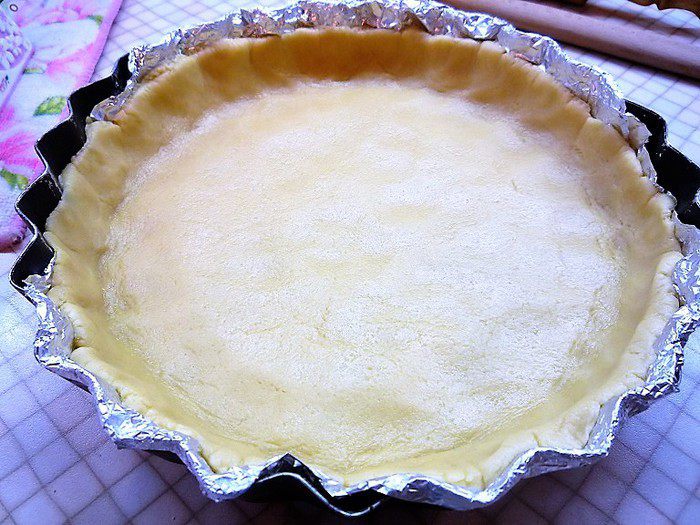 Форму для выпечки выстилаем фольгой или бумагой для выпечки, раскатываем по диаметру формы из теста круг, укладываем его в форму формируя высокие бортики. Выпекаем в заранее разогретой духовке при температуре 180°С в течении 15 минут.