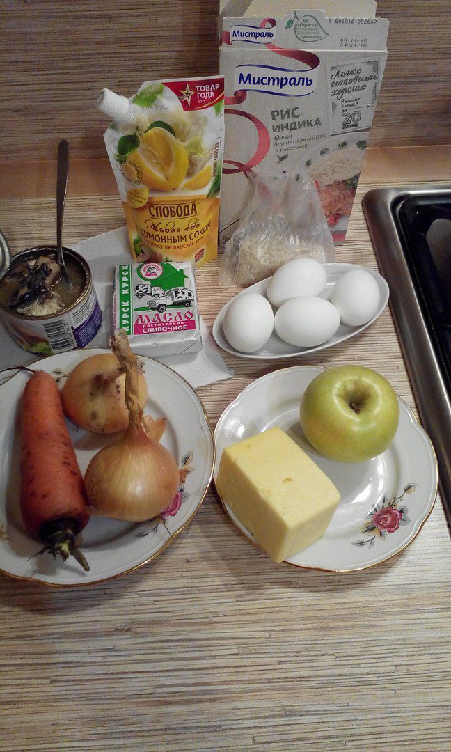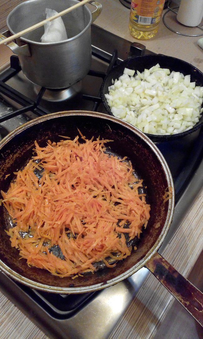 Морковь, натертую на крупной терке, и лук, мелко нашинкованный, обжарить на растительном масле. Рис отварить до готовности.
