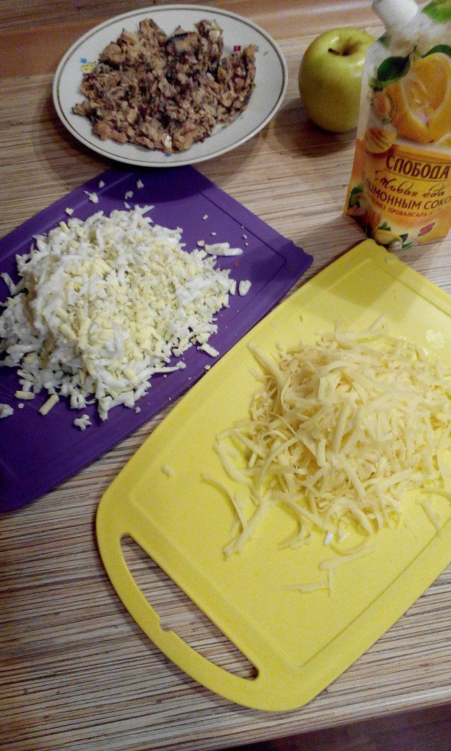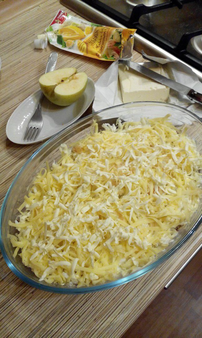Следующий слой: сыр, ½ яблока (натереть на крупной тёрке) и сливочное масло (предварительно заморозить).