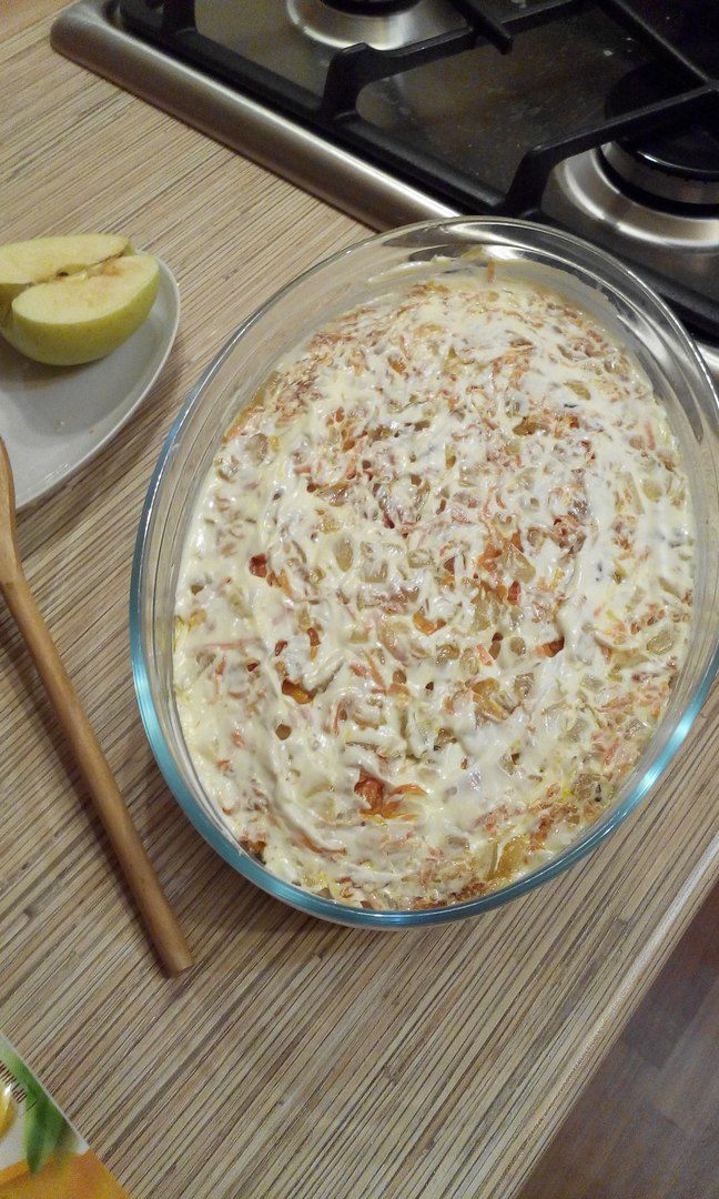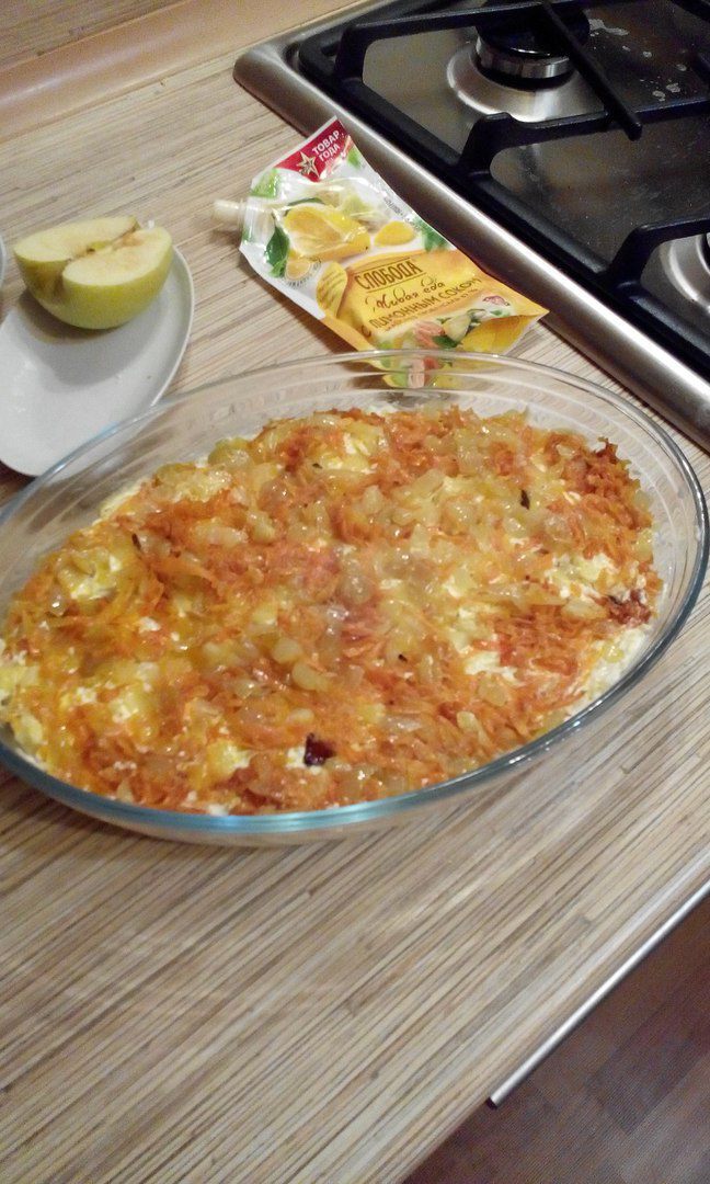 Теперь укладываем лук и морковь (обязательно остудить).