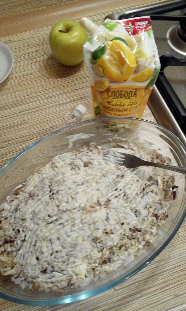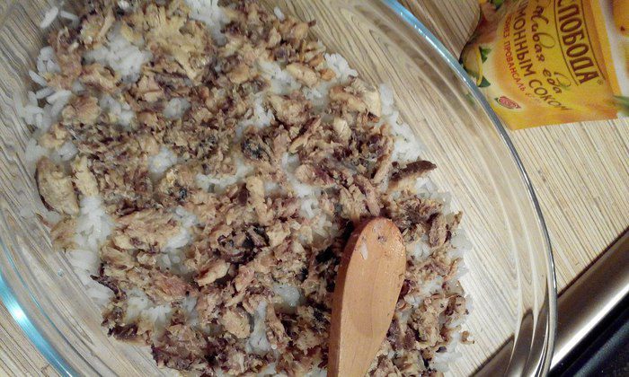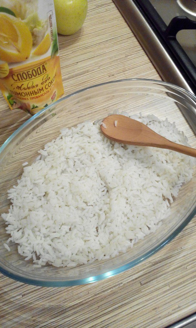 Начинаем собирать салат. Первым слоем укладываем рис.