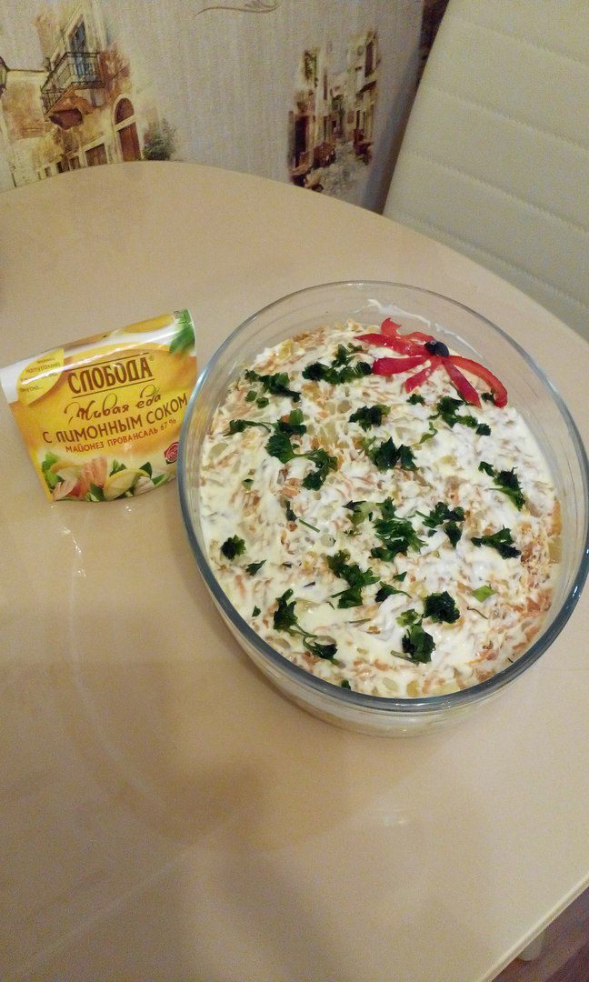 Все, салат готов! Украшаем и оставляем салат на некоторое время на холоде. Поверьте, он уйдет «на ура»!!!