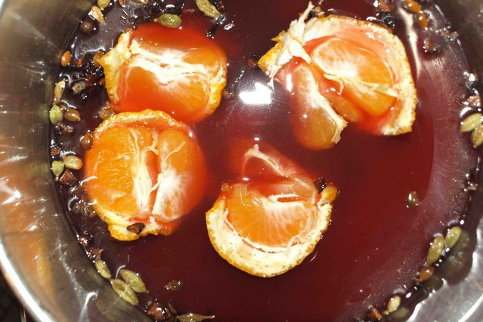 В посуде, в которой будем готовить глинтвейн, смешать яблочный и вишневый сок. Добавить пряности, сахар, мандарин разделенный на несколько частей. Поставить на средний огонь и помешивая прогреть до 70 — 80°С. Не доводить до кипения.