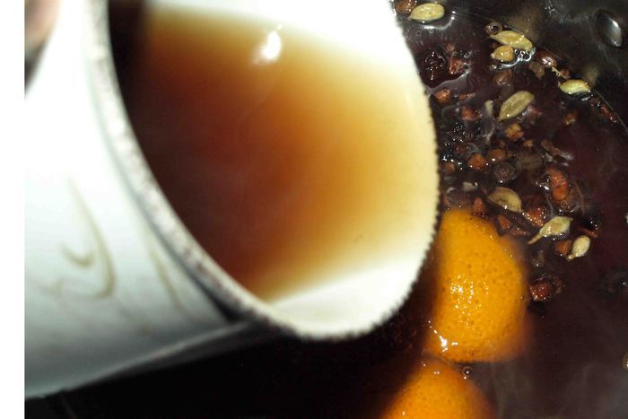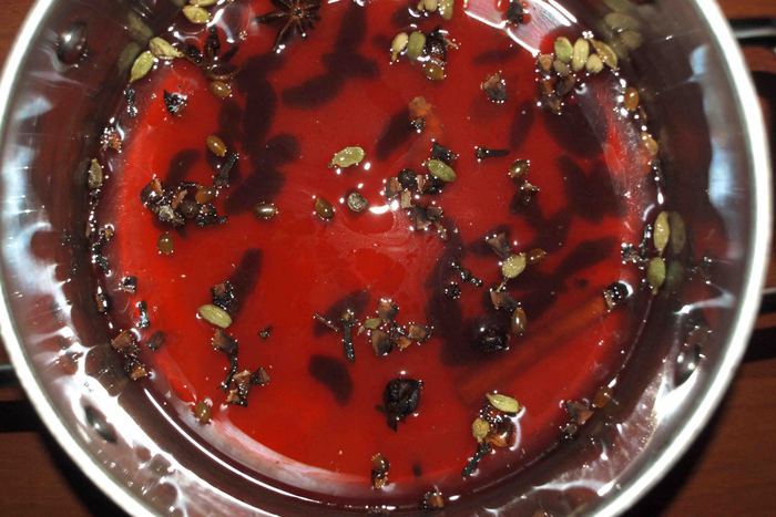 Чай процедить. Добавить в смесь соков и пряностей. Важно, именно, чай добавлять в сок, а не сок в чай. От этого зависит правильный вкус. Прогреть не доводя до кипения.