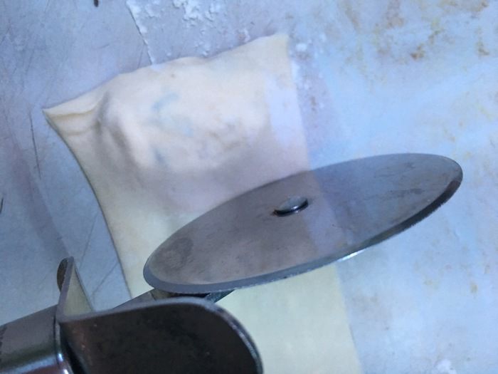 Есть множество способов лепки равиоли. Идеальный — специальные приборы. Я же закрываю начинку тестом сбоку. Хотя лучше всего раскатать пласт, выложить начинку на, одинаковой удаленности друг от друга, начинку и закрыть сверху еще одним пластом теста и вырезать.