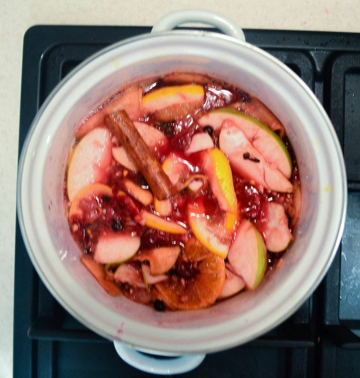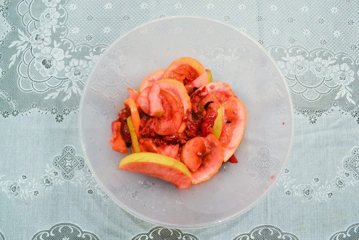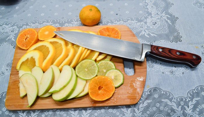 Фрукты нарежем. Я предпочитаю резать тонко, но крупными ломтиками, так фрукты отдают максимум сока, но при этом не норовят попасть в бокал, когда разливаешь глинтвейн.