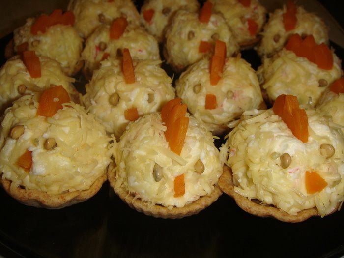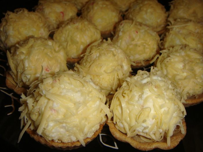 Обвалять шарики в тертом сыре и положить в тарталетки.
