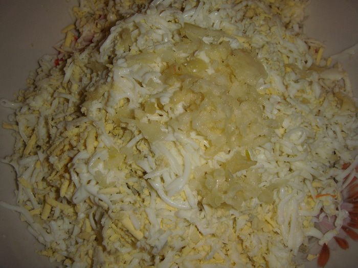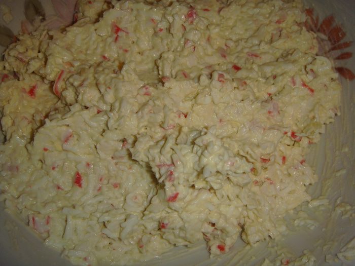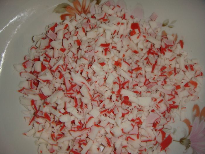 Крабовое мясо мелко нарезать.