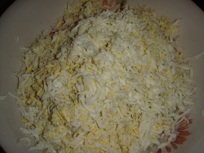 Яйца отварить и натереть на терке.