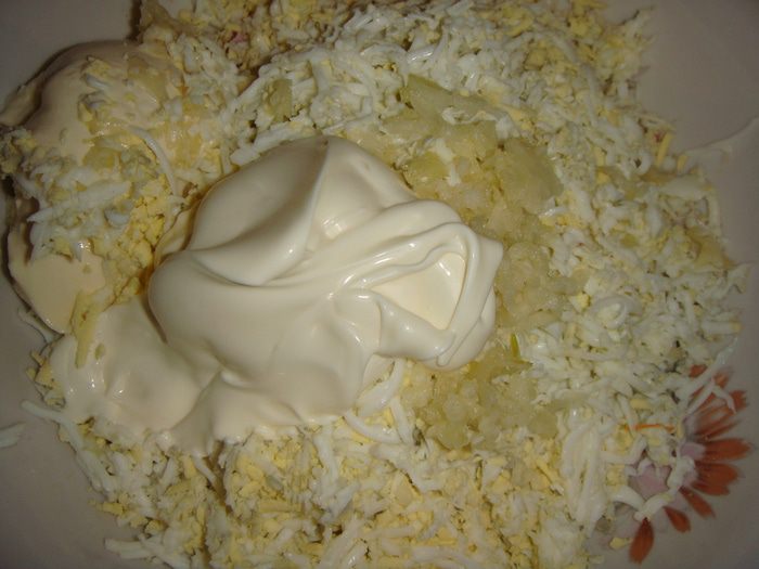 Посолить по вкусу. Добавить сливочный сыр и майонез.