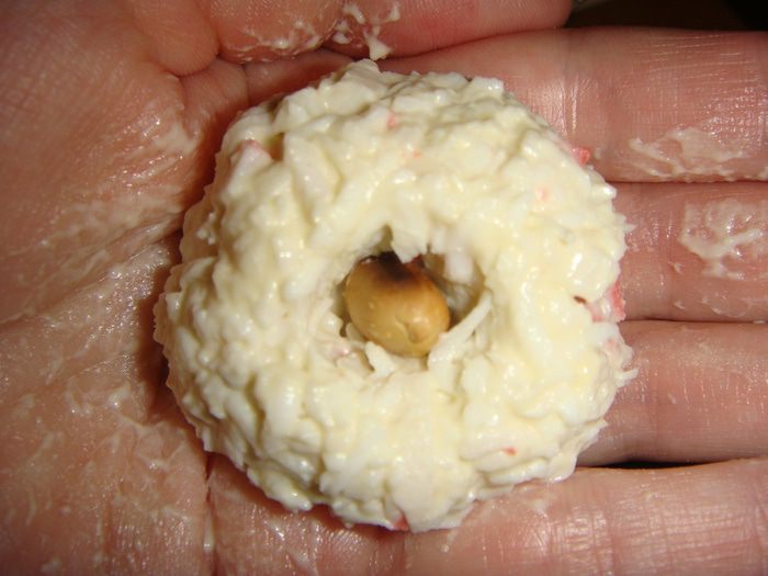 Формируем руками шарики размером с тарталетки. Внутрь каждого шарика положить по одному орешку. Тарталетки я готовила сама, вот рецепт http://www.edimdoma.ru/retsepty/91231-postnye-tartaletki-s-ryboy. Но можно и покупные, как вам больше нравится.