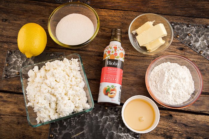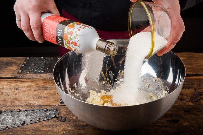 В размягченное сливочное масло добавить растертый творог, абрикосовое масло Biolio, сахар. Все растереть.