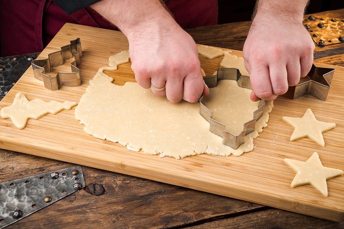 Тесто раскатать скалкой до толщины 6 мм. С помощью фигурных формочек вырезаем печенье.