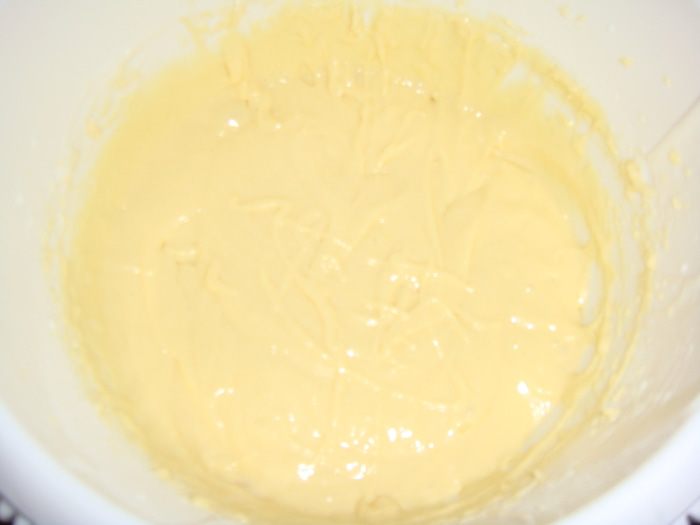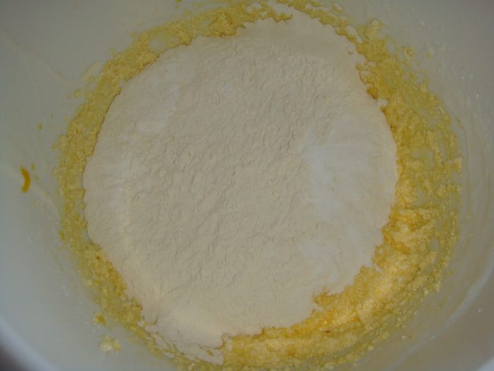 Желтки перетереть с оставшимся сахаром. Добавить растопленное сливочное масло и перемешать. Муку просеять с разрыхлителем и всыпать в желтковую смесь. Замесить тесто.