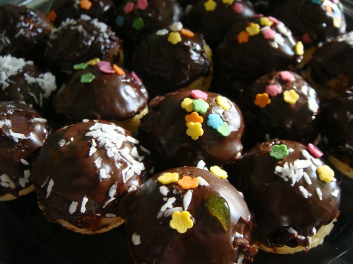 Пока шоколад не застыл, украсить шарики кондитерской посыпкой. После того, как шоколад застынет, переложить кейк-боллы в бумажные капсулы. Блюдо для детского праздника готово!