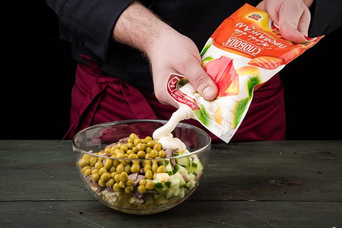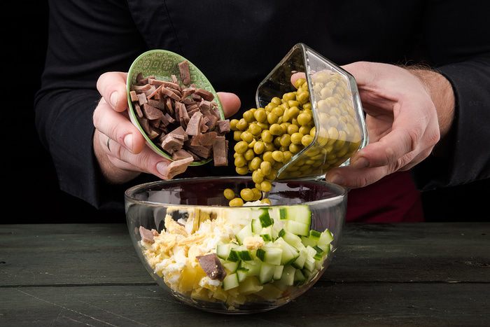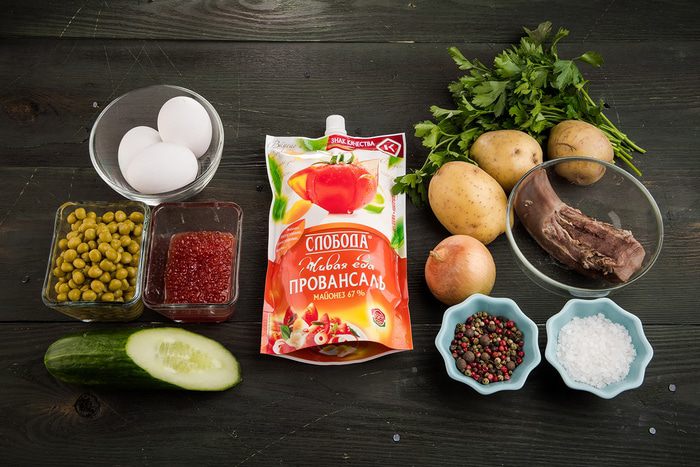 Соединить вместе язык, картофель, яйца, лук, огурцы, горошек. Все хорошо перемешать, посолить и поперчить по вкусу.