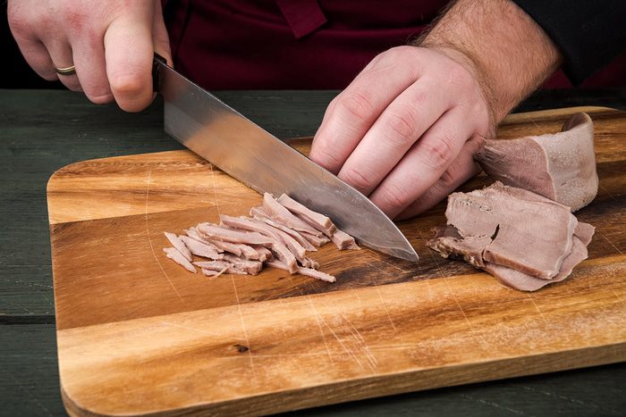 Свиной язык отварить в подсоленной воде, очистить и нарезать на небольшие кусочки. Отварить и очистить картофель, нарезать его кубиками. Также отварить яйца и нарезать кубиками. Лук мелко нарезать, ошпарить кипятком. Огурцы нарезать средними кубиками.