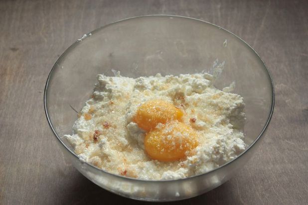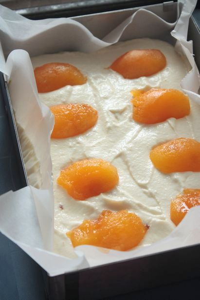 Творожную массу выложите в форму, выстеленную бумагой для запекания. Если вы используете свежие абрикосы, снимите с абрикосов кожицу, разрежьте напополам и в произвольном порядке выложите на будущую запеканку, слегка «утопив» их в массе. Если у вас под рукой оказались консервированные, то тщательно просушите их от сиропа и также выложите в запеканку.