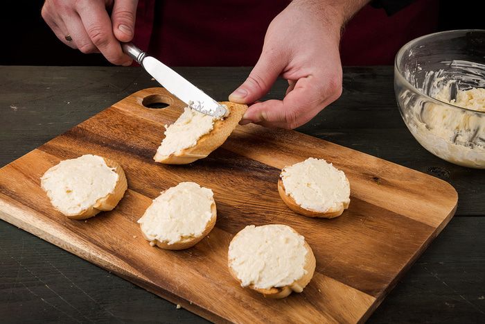 Все смешать. Смазать массой кусочки багета.