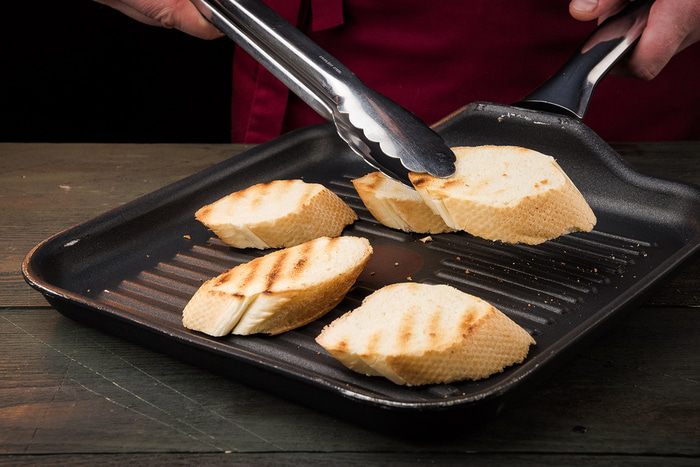 Багет нарезать ломтиками и поджарить.