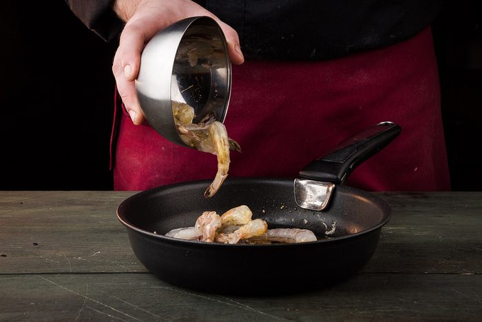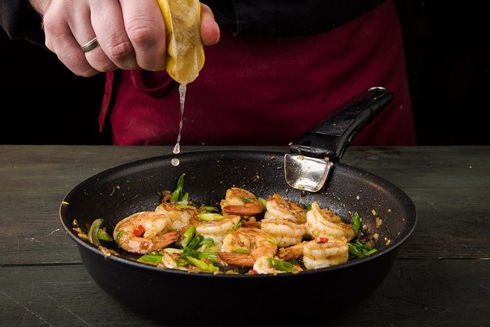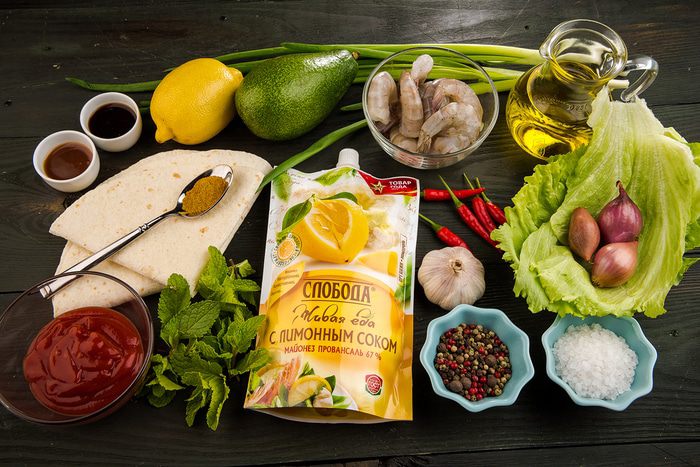 Перец чили, зеленый лук тонко порезать наискосок, добавить к креветкам, посолить и перемешать. Из лимона выжать сок и обжарить все до готовности. Авокадо почистить и, удалив косточку, нарезать тонкими ломтиками, затем сбрызнуть оставшимся лимонным соком.