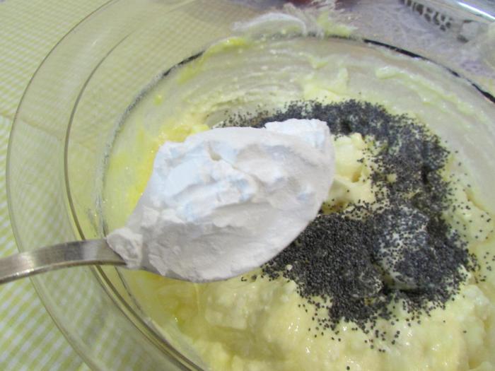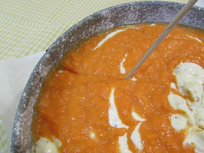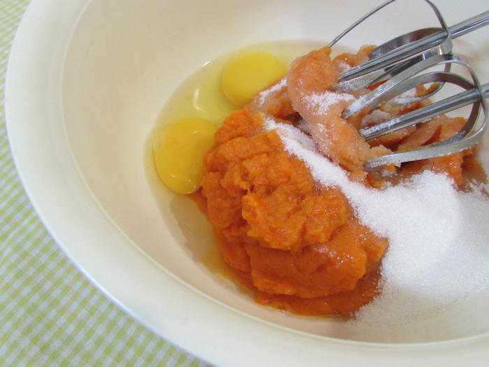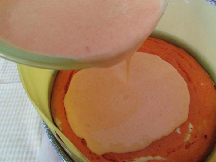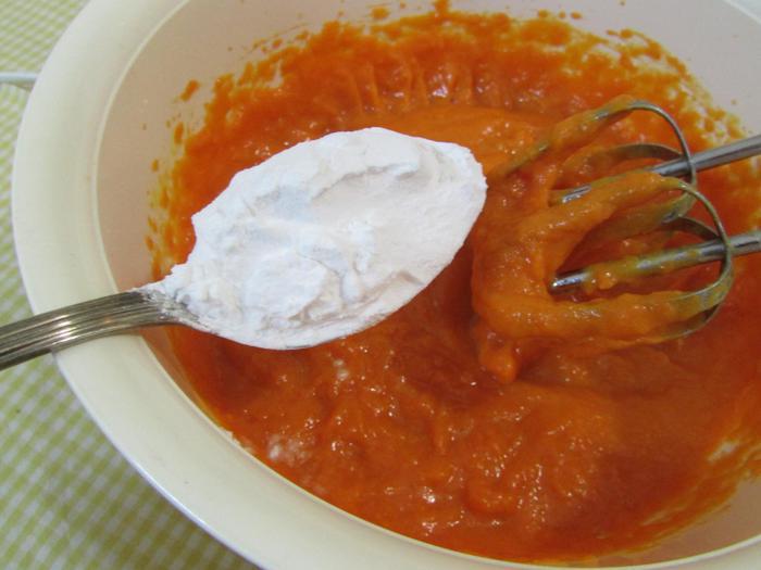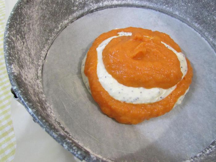 Застелить дно разъемной формы для запекания (22 см) пекарской бумагой. Смазать форму сливочным маслом и присыпать мукой. Лишнюю муку стряхнуть. Затем выложить творожную и тыквенную основы поочередно строго в центр по столовой ложке. Когда основы закончатся, постучать слегка формой с запеканкой по столу, чтобы масса распределилась равномерно по всей форме.