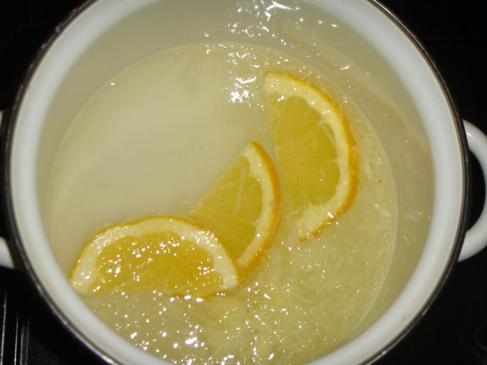 Воду довести до кипения. Выложить в кастрюлю имбирь, добавить сок лимона, дольки апельсины и выключить газ. Кастрюлю накрыть крышкой и оставить настаиваться 30 минут.