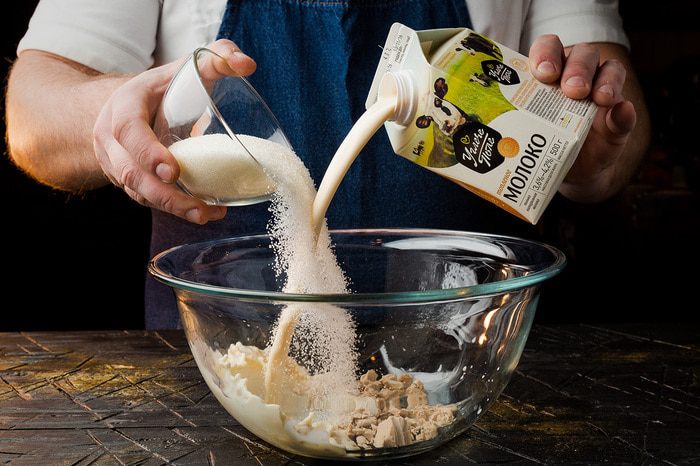 Начинаем готовить тесто. В теплом топленом молоке ТМ «Углече Поле» разведите дрожжи и добавьте 3 ст. л. сахара. Оставить, чтобы масса подошла.