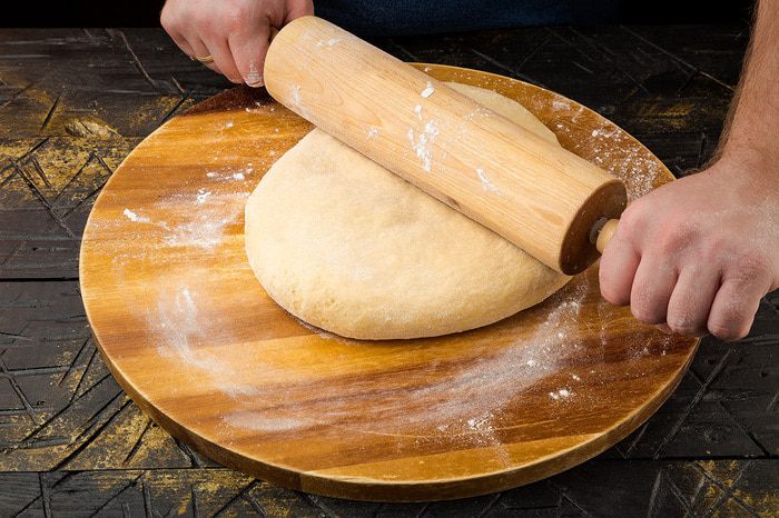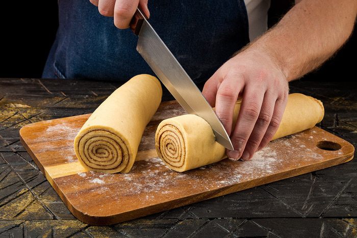 Раскатываем тесто в пласт толщиной 5 мм, посыпаем корицей, сворачиваем рулетом.