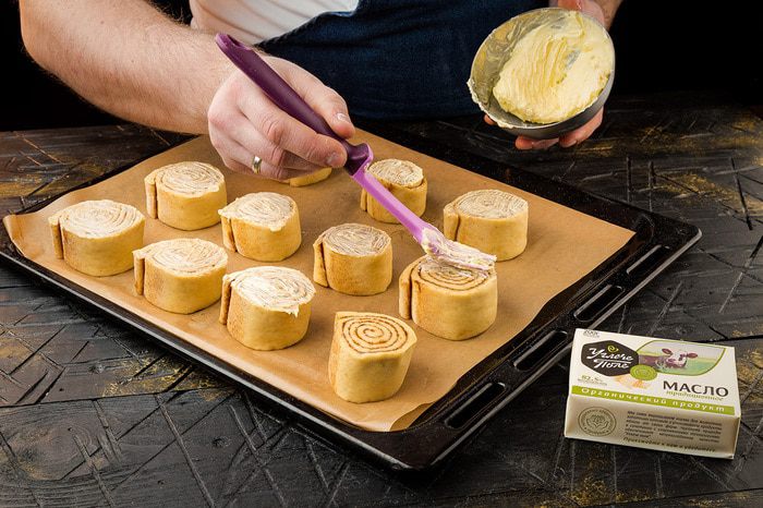 Выкладываем получившиеся рулетики на противень, смазываем каждый сливочным маслом и выпекаем при 170°С 1 час.