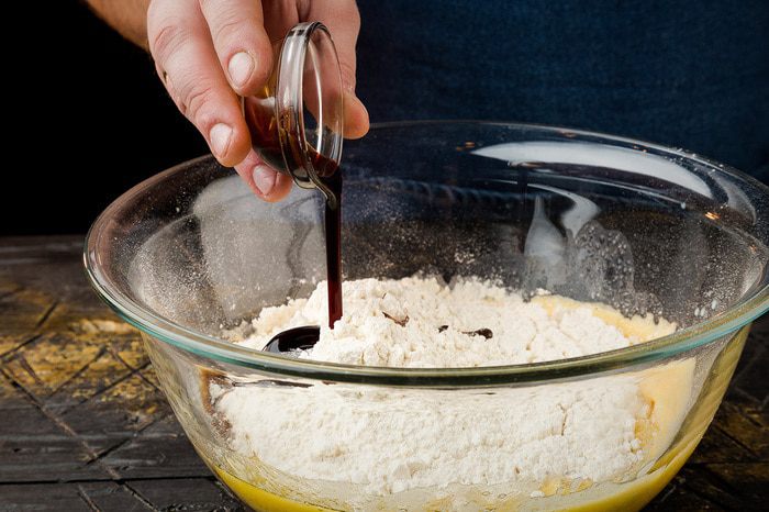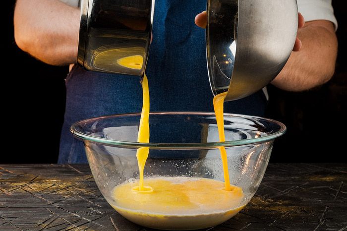 Добавить в дрожжевую массу растопленное сливочное масло и желтки (предварительно немного взбить).