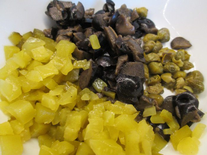 Нарезаем мелко каперсы, огурцы и маслины.
