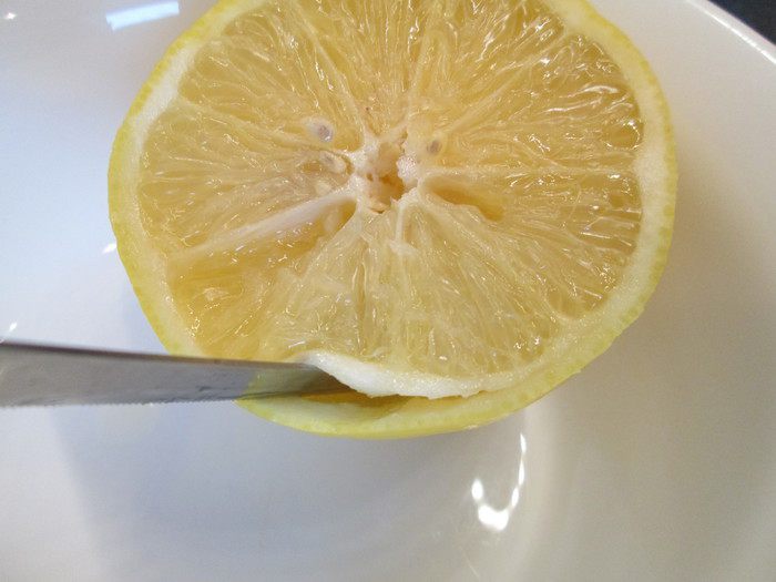 Срезать у лимонов шляпку. Зубчатым ножом надрезаем лимон по кругу между мякотью и кожурой.