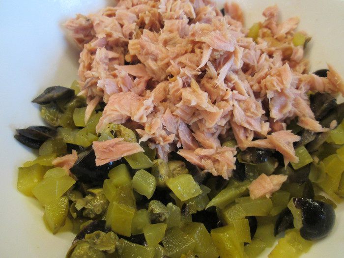 Тунец разделяем на кусочки и соединяем с фасолью и остальными, уже нарезаными ингредиентами. Заправляем майонезом.