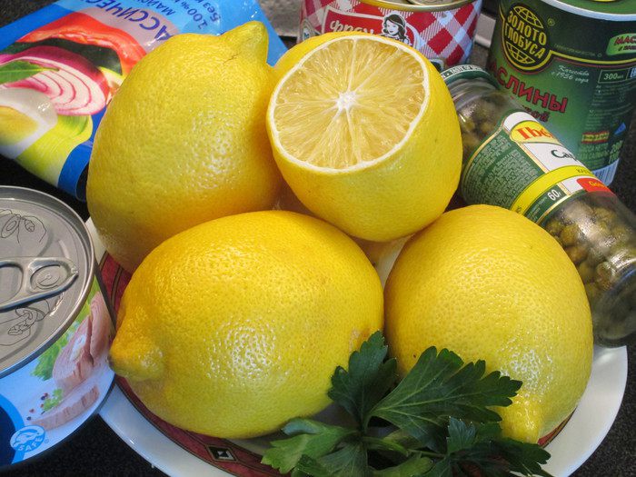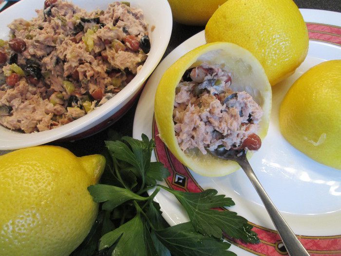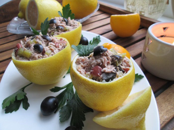 Limono ripieni al tonno — так звучит по-итальянски название этого блюда из тунца в лимонах. Меня привлек его яркий вид — он создает праздничное настроение.