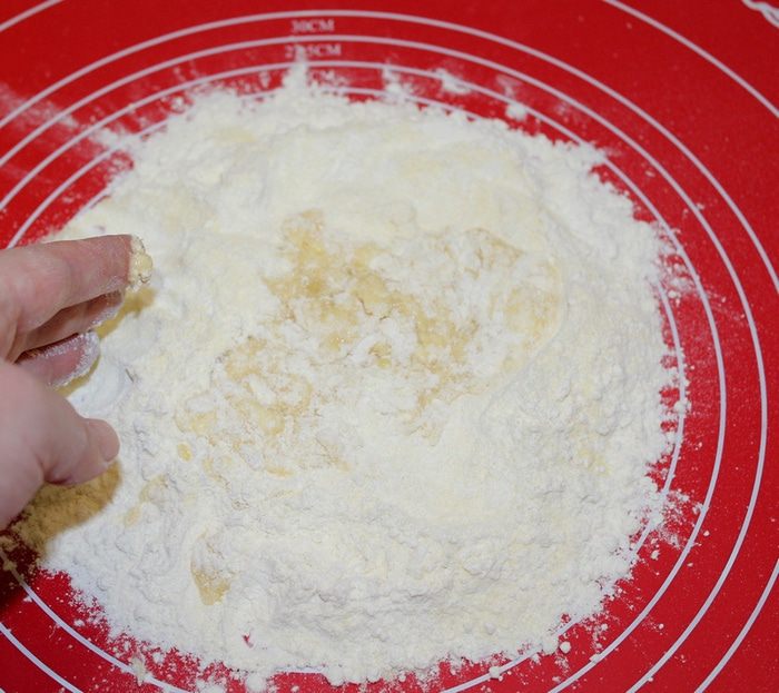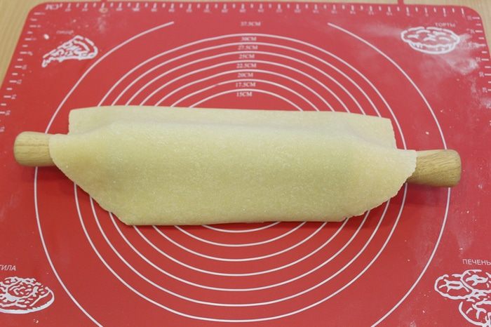 Разделите тесто на две части, одну держите в пакете. Вторую раскатайте, слегка припылив поверхность стола (коврика) мукой. Раскатать нужно довольно тонко и равномерно, (у меня были видны полоски коврика).
