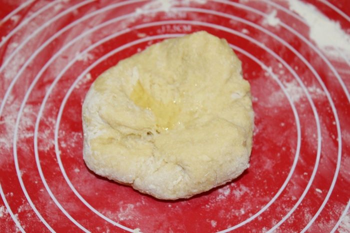 Замесите тесто, добавьте оливковое масло. Вымешивайте тесто около 4-х минут.