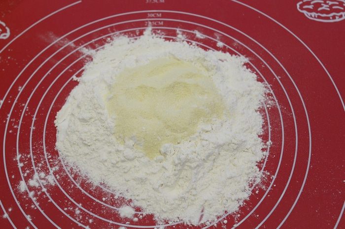Отвесьте нужное количество муки и семолины, насыпьте горкой, перемешайте.