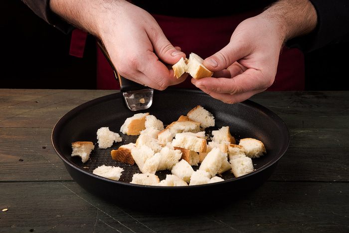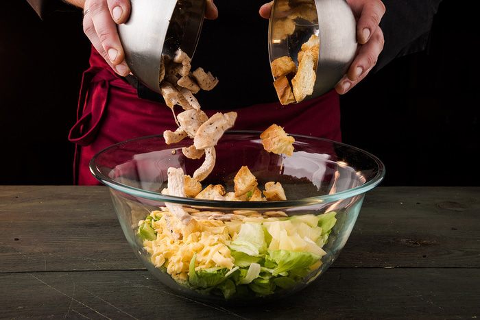 Сверху положить сухарики и полить салат заправкой.