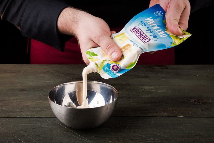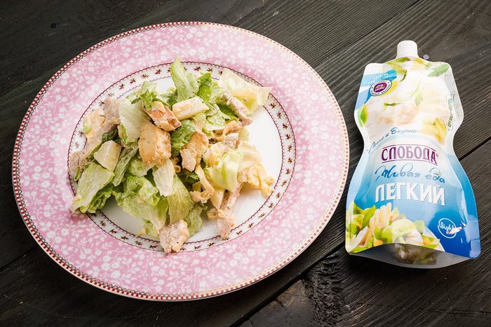 Приготовить заправку: чеснок пропустить через пресс, добавить майонез Легкий ТМ «Слобода» и лимонный сок.