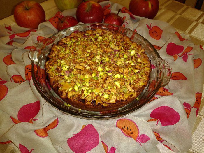Орехи измельчить (у меня фисташки) и посыпать пирог. Подавать к чаю или кофе. Очень вкусно с молоком.
