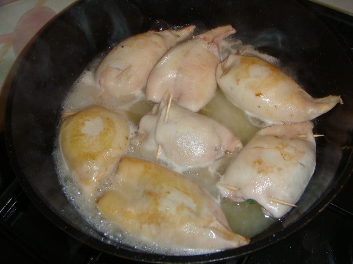 Сковороду разогреть, налить оливковое масло и выложить кальмары. Немного их обжарить с двух сторон. Налить оставшееся вино и положить перец чили. Посолить по вкусу и тушить на слабом огне минут 30, периодически переворачивая кальмары.