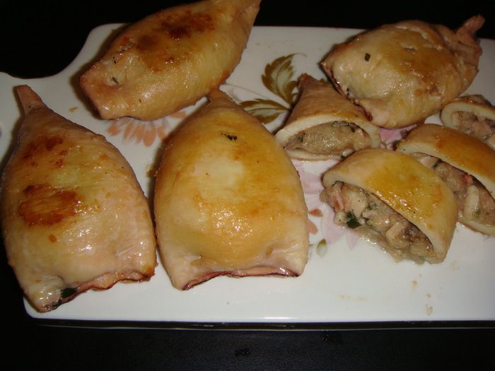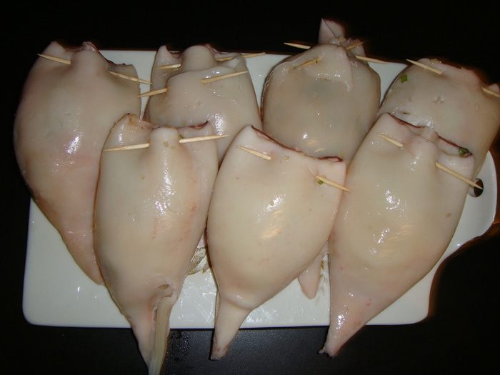 Тушки кальмаров нафаршировать начинкой и заколоть зубочистками.