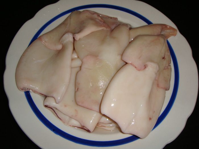 Размороженные кальмары обдать кипятком, очистить от пленки и промыть. Дать стечь воде. У меня в килограмме кальмаров было 8 шт.