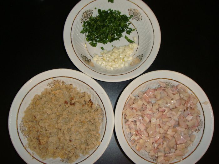 У кальмаров срезать плавники. Плавники и одного кальмара нарезать средними кубиками. Хлеб замочить в небольшом количестве вина и размять. Немного петрушки и чеснок порубить. Смешать все ингредиенты, посолить и поперчить по вкусу.