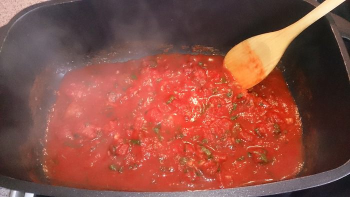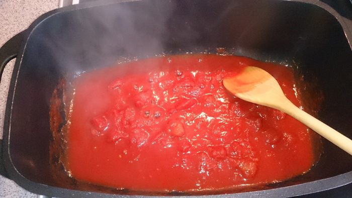 Прогреваем рубленые томаты в собственном соку.