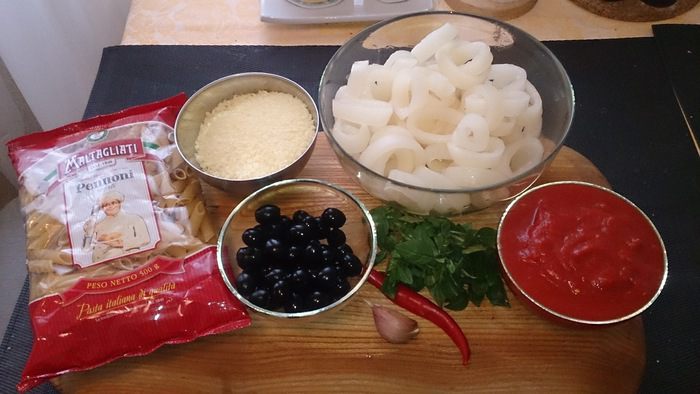 Ну вот и ее величество паста! Это блюдо хочется кушать всегда и везде, это классика итальянской кухни! Вот и я тоже очень люблю сочетание густого томатного соуса с чесноком, базиликом, маслинами и жареными кальмарами. Поэтому хочу поделится с вами этим вкусным рецептом. Приступим!